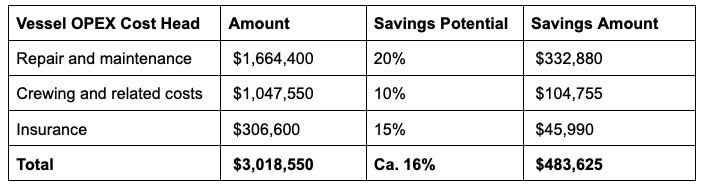 In one of KPMG’s maritime industry research studies, it was determined that digital solutions can help reduce OPEX by 10%-20% per category. For an average container vessel with ca. US$ 3,000,000 OPEX / year, the saving potential amounts to over US$ 483,000 per vessel per year. For a company that has 40 vessels under management, this represents over US$ 19,000,000 in savings per year.